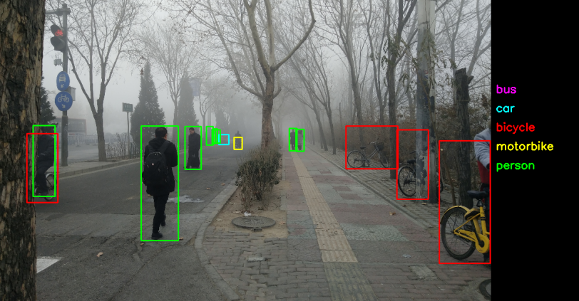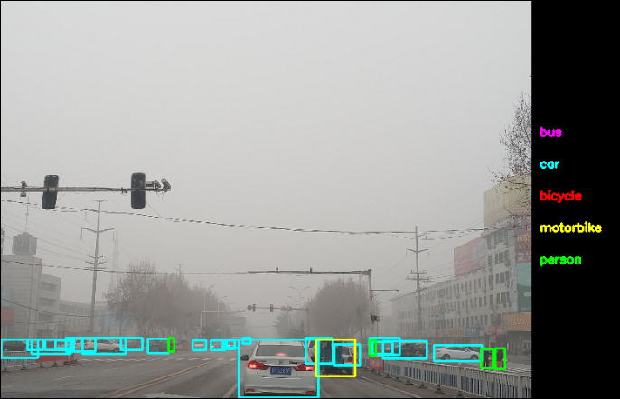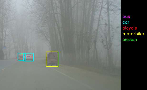 在CVPR 2019 UG2+ Track 2 的 “阴霾场景下的(半)监督目标检测” 竞赛中,组委会提供了来自交通监控场景的 4,322 张标注的图像和 4,807 张未标注的真实的雾天图像。雾天图像目标检测需要在阴霾天气下实现对目标的有效检测,由于阴霾天气下图像质量差,目标难于观测,使得常见的深度目标检测算法在这种环境下检测性能大大下降。