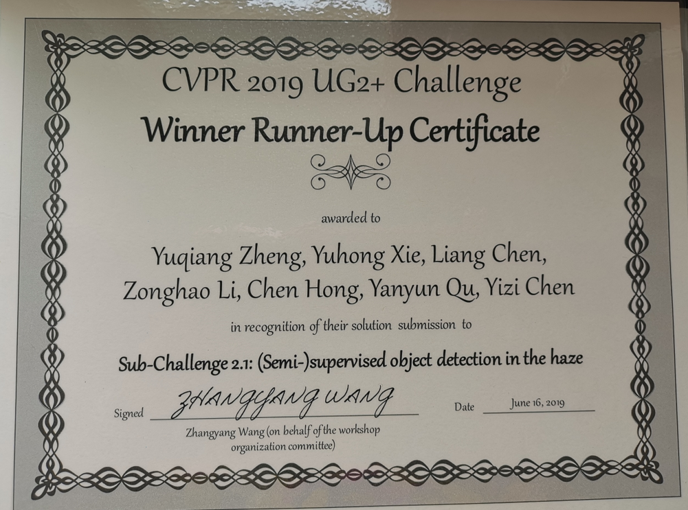 2019年6月16日,IEEE计算机视觉与模式识别会议(Conference on Computer Vision and Pattern Recognition 2019,CVPR 2019)在美国长滩顺利召开。该会议与 ECCV、ICCV 共称为计算机视觉领域三大顶级学术会议,9227位相关领域专家、学者参会并交流研究成果。同时,CVPR 2019 举办了多项竞赛,来自世界各地的参赛队伍参加了这些比赛,高手如林,竞争非常激烈。厦门大学计算机系曲延云教授和李翠华教授指导的两支队伍参加了NTIRE 2019挑战赛中的“图像去雾”竞赛和UG2+ 挑战赛Track 2 的 “雾霾场景下的(半)监督目标检测” 竞赛,并分别获得Runner Up奖。