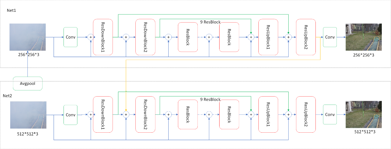 系参赛队伍根据小图像较容易恢复的特点,提出了一种多尺度级联生成对抗网络进行图像去雾,模型结构如图5所示。首先使用256*256的图像训练一个网络恢复出图像的全局信息,然后将小尺度图的特征上采样后级联到大尺度网络,恢复出细节信息。同时,该网络将原始输入图像合并到所有残差块中,以保证浅层和深层模块都能获取到原始的输入信息。相比于传统图像去雾算法,该模型直接构建了从有雾图像到无雾图像的映射,并能充分利用原始浓雾图像的多尺度信息。