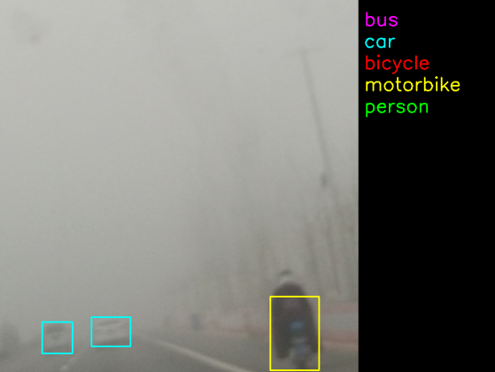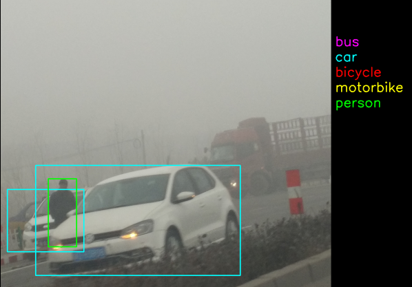 在CVPR 2019 UG2+ Track 2 的 “阴霾场景下的(半)监督目标检测” 竞赛中,组委会提供了来自交通监控场景的 4,322 张标注的图像和 4,807 张未标注的真实的雾天图像。雾天图像目标检测需要在阴霾天气下实现对目标的有效检测,由于阴霾天气下图像质量差,目标难于观测,使得常见的深度目标检测算法在这种环境下检测性能大大下降。