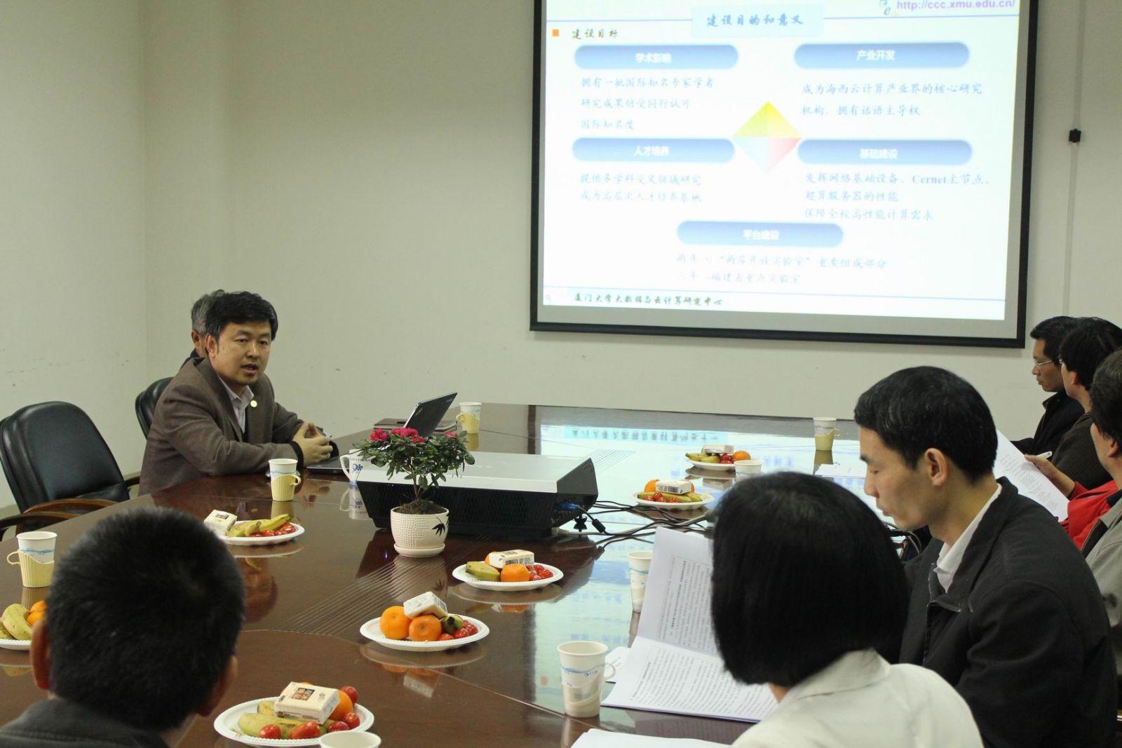 3、研究中心的建立已经具备了成熟的条件。在研究队伍方面,目前,研究中心已经拥有一支优秀的团队,包括首席科学家6名(包含闽江讲座教授、厦门大学讲座教授),教授11名,副教授11名,助理教授14名,高级工程师5名,工程师15名。在硬件方面,现有科研用房1000余平米,拥有厦门大学“985 工程”二期“智能化国防安全信息技术”科技创新平台和厦门大学高性能计算系统,并有效整合信息与网络中心所拥有的下一代互联网CNGI-GERNET2国家核心节点资源,具备了开展云计算与大数据研究所需要的实验条件。