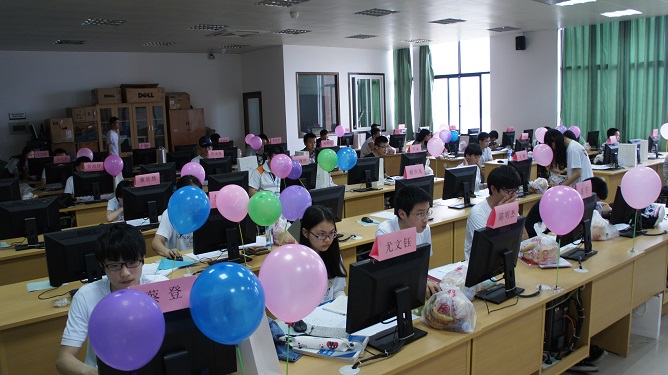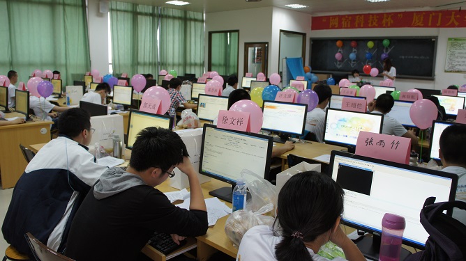 厦门大学程序设计竞赛是信息学院学生活动的招牌之一。一直以来,吸引着校内外许许多多编程爱好者参加。经过两场预赛,我校26名优秀选手脱颖而出,进入到5月11日的决赛。由福州大学、厦门双十中学、厦门六中及福州长乐一中推荐的数十名优秀选手也纷纷来到决赛现场。通过试机,选手们熟悉考场,决赛于中午12时15分开始。长达五个小时的比赛中,无形的硝烟弥漫赛场,随着象征成功答题的彩色气球不断升起,决赛现场的竞争渐趋白热化。
