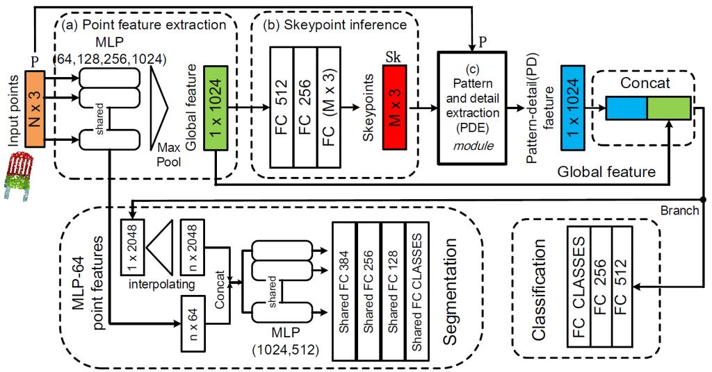 简介:该论文提出了一个端到端的网络框架SK-Net,针对特定点云任务的点云特征学习和空间关键点的推理进行联合优化。论文中提出两个建议的调节损失与特定任务相关的目标函数一起指导空间关键点的生成。同时SK-Net提取关键点的局部结构(细节特征)和归一化关键点的局部空间模式(模式特征),使得网络可以有效地理解点云不同区域之间的相关性,整合点云的上下文信息。在分类和分割等点云任务中,SK-Net性能可与最新方法相媲美。论文共同第一作者是信息学院2017级硕士研究生吴炜坤和信息学院2015级博士研究生张艳,通讯作者是信息学院雷蕴奇教授。