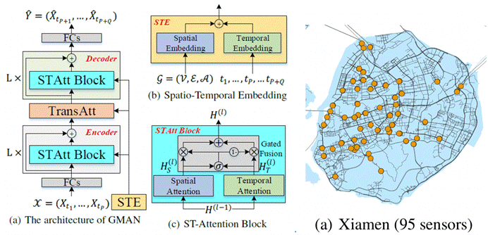 简介:该论文提出了时空多层注意力图网络模型GMAN,基于交通传感数据对1小时后的全城路网流量预测,准确率在厦门达到84.16%, 在国际数据集达到95.69%,性能领先。特别地,GMAN为城市级别的中长期(1小时级以上)交通流量预测提供了理论参考。论文第一作者是信息学院2018级博士研究生郑传潘,通讯作者是信息学院范晓亮高级工程师。