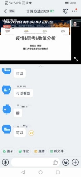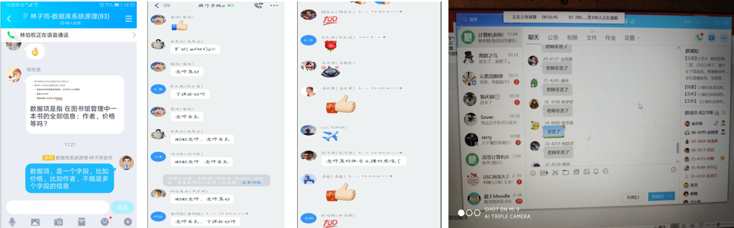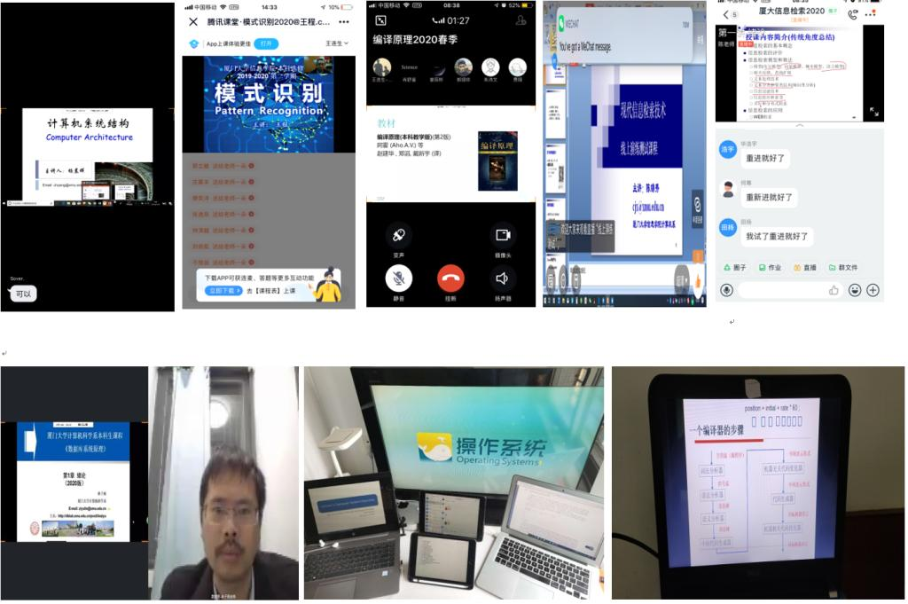 计算机系本学期共有课程 18 门开课建群。计算机系行政领导班子和计算机系教工党支部在学院的统筹 安排下积极指导全系教师将厦门大学课程中心平台及网络授课平台结合起来,有效利用线上网络教学的优 势,借助中国大学MOOC、腾讯课堂、腾讯会议、钉钉等各类网络教学平台进行教学直播,充分保证疫情 防控期间的教学进度及教学质量,做到“停课不停学”,实现“学习不延期,质量有保障”。
