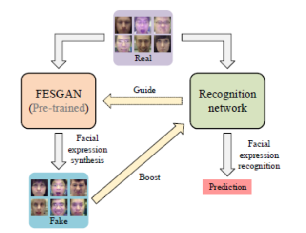 (5)由计算机系严严副教授、硕士研究生黄颖合作完成的论文“Joint Deep Learning of Facial Expression Synthesis and Recognition”被多媒体领域国际权威期刊IEEE Trans. on Multimedia(JCR2区,影响因子5.452)接收。该论文针对小规模数据集下的人脸表情识别场景,利用近年来十分具有前景的的生成式对抗网络与人脸表情识别网络联合训练,有效地提高了模型训练数据的多样性。在联合训练过程中,使用一种新型的类内损失以及一种真实样本导向的梯度更新方法,有效地缓解生成样本与真实样本的数据偏差,从而降低了生成样本的参与可能导致的模型欠拟合的问题。该论文由厦门大学计算机系王菡子教授、澳大利亚阿德莱德大学沈春华教授和厦门理工学院的陈思副教授共同合作完成。