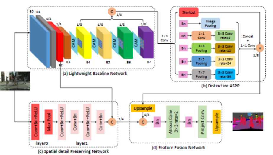 (3)由计算机系硕士研究生董根顺完成的论文“Real-Time High-Performance Semantic Image Segmentation of Urban Street Scenes”被智能交通系统领域国际权威期刊IEEE Trans. on Intelligent Transportation Systems(JCR2区,影响因子5.744)所接收。该论文以实际应用需求为导向,并结合语义分割发展趋势而提出。论文主要由带有孔洞卷积和注意力的轻量级特征提取基础网络、更具鉴别性与信息量的孔洞空间金字塔池化、补充细节的空间信息保持网络和简单有效的特征融合网络四个部分组成。该方法在Cityscapes等公开数据集上拥有快速(实时)预测的效果和优秀的分割精度。该论文由厦门大学计算机系严严副教授、王菡子教授以及阿德莱德大学沈春华教授共同指导完成。