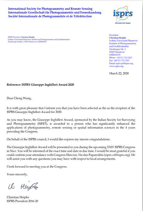 3月22日,国际摄影测量与遥感学会授予了计算机科学系王程教授Giuseppe Inghilleri奖,以奖励他在激光雷达点云理解和信息提取领域的突出贡献。