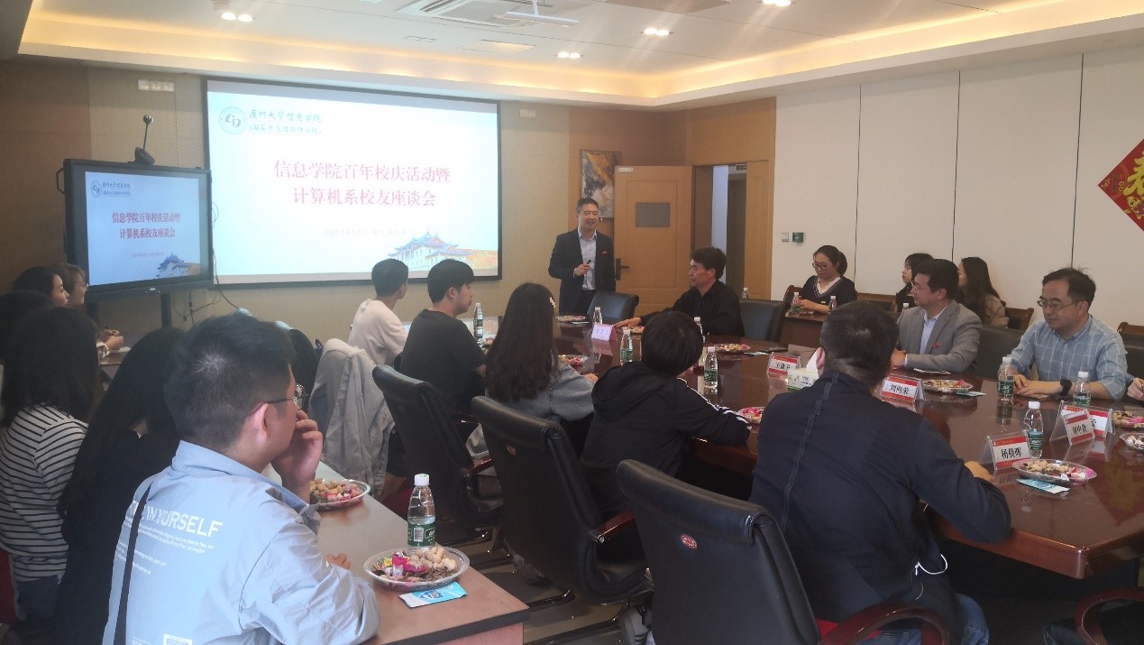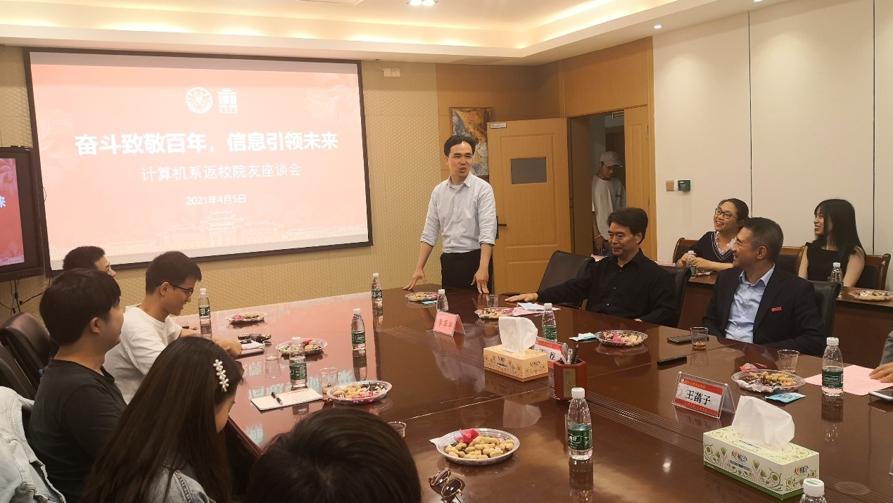 2021年4月5日,正值厦门大学百年华诞之际,计算机系返校座谈会在海韵园行政楼C610举行。信息学院副院长王程、计算机系主任王菡子、计算机系支部书记曲延云、计算机系副主任刘向荣、陈中贵、计算机系教工李翠华、杨晨晖、韩海雄、林志琼、刘松月、谢怡、沈思淇等人与各地归来的30余名计算机系校友欢聚学院,共诉母校情、师生情和同窗情。