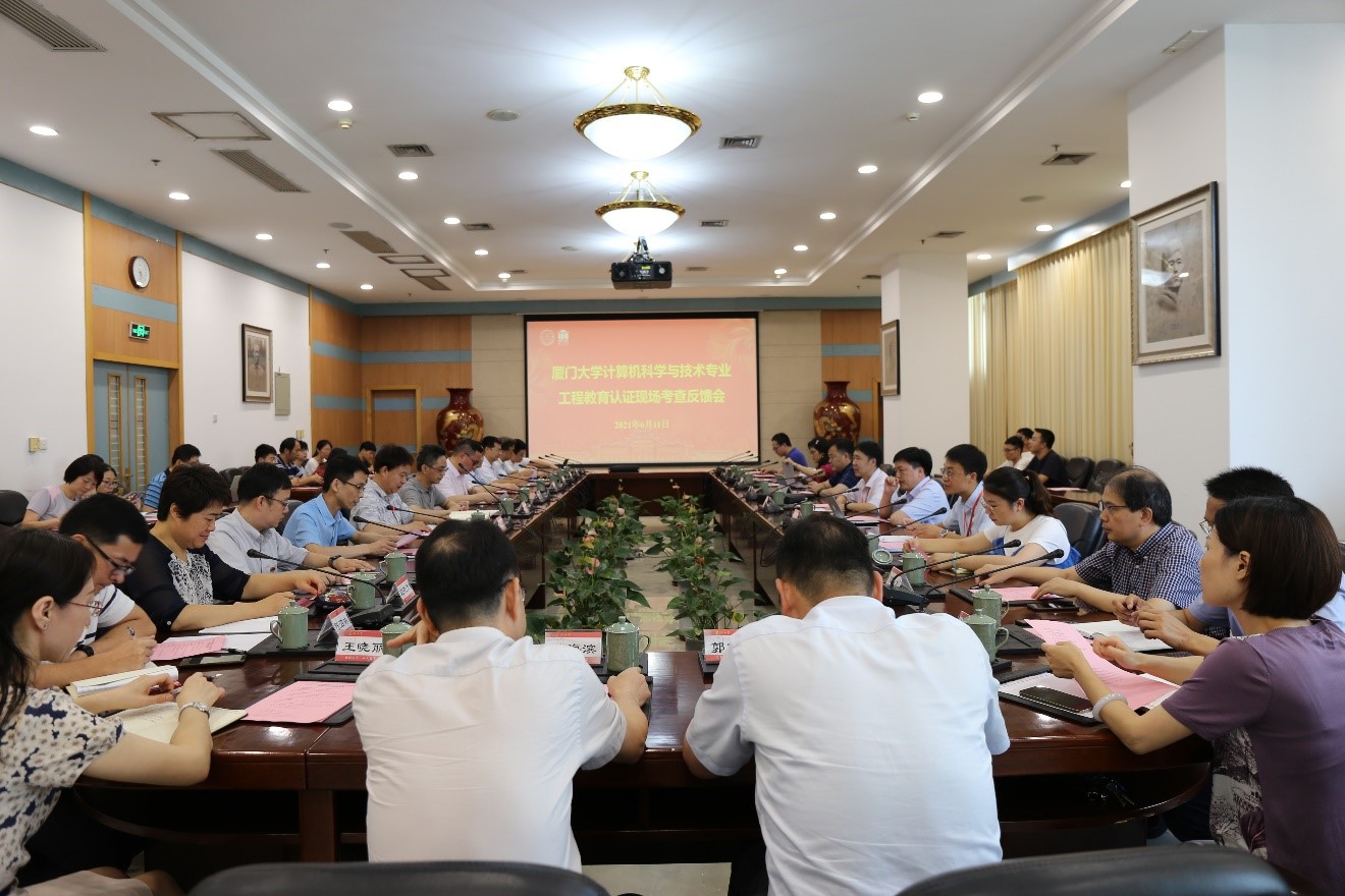 6月11日下午,考查组专家意见反馈会在颂恩楼215会议室举行。我校副校长周大旺教授、招生办主任刘艳杰、教务处、学校办公室、学生工作部(处)等职能部门负责人、信息学院党政班子、计算机科学与技术系党政班子以及教师代表等参加了反馈会。会上,考查组组长王宽全教授向我校反馈考查总体情况。考查组认为我校各类教学资源丰富、实验室管理规范、用人单位对毕业生评价高、在校生对教师认可度高、教师对工程认证理念理解到位,教学工作有特色,厦门大学计算机科学技术与技术专业已经建立了OBE教学模式,达到了工程教育专业认证的要求。但是,在定期评价和修订培养目标,毕业生跟踪反馈和相关数据的分析利用,解决复杂工程问题能力培养等方面还存在不足。专家刘贵松教授反馈了加强新生研究方向指导、利用各类资源围绕新技术加快新平台建设、优化教师分类评价体系、课程评价机制、注重学生培养全过程管理等问题,请学校和学院对专业建设给予持续关注和支持。专家林雪纲总经理反馈了加强学生代码和工程能力的培养、加快对新技术的实验条件投入、量化教学业绩评定等方面意见。