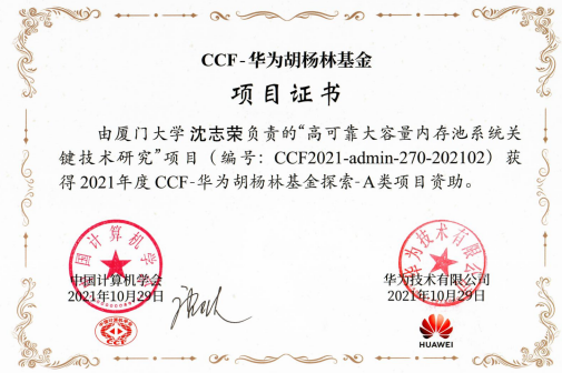 我系张一鸣老师和沈志荣老师也在CNCC 2021(中国计算机大会)上获颁“CCF-华为胡杨林基金”项目证书。“CCF-华为胡杨林基金”由华为与中国计算机学会联合发起,目前已经覆盖区块链、数据库、形式化方法、高性能计算、系统软件、软件工程等多个领域,累计投入金额千万级人民币。张一鸣老师获得资助的项目为“面向高速NVMe存储器的blkmq层优化和中断聚合研究”,沈志荣老师获得资助的项目为“高可靠大容量内存池系统关键技术研究”。