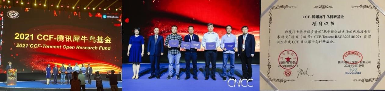 2021年12月17日,我系李辉老师于深圳召开的CNCC 2021(中国计算机大会)上获颁“CCF-腾讯犀牛鸟基金”项目证书。“CCF-腾讯犀牛鸟基金”是面向毕业后在高校/科研院所工作不超过5年的男性青年学者或工作不超过10年的女性青年学者的基金项目。李辉老师获得资助的项目为“基于预训练方法的代码搜索技术研究”。