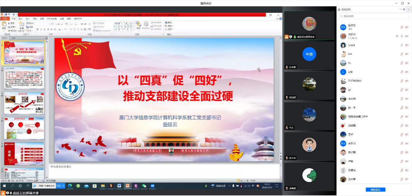 2022年3月25日晚上7点,计算机科学与技术系教工党支部召开专题组织生活会和民主评议党员大会,会议由支部书记曲延云同志主持。因疫情防控要求,本次会议以线上会议的方式进行。