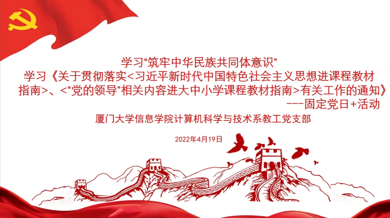 2022年4月19日下午,计算机科学与技术系教工党支部召开“固定党日+”活动,集体学习“铸牢中华民族共同体意识”。会议由支部副书记严严同志主持,因疫情防控要求,本次会议以线上会议的方式进行。