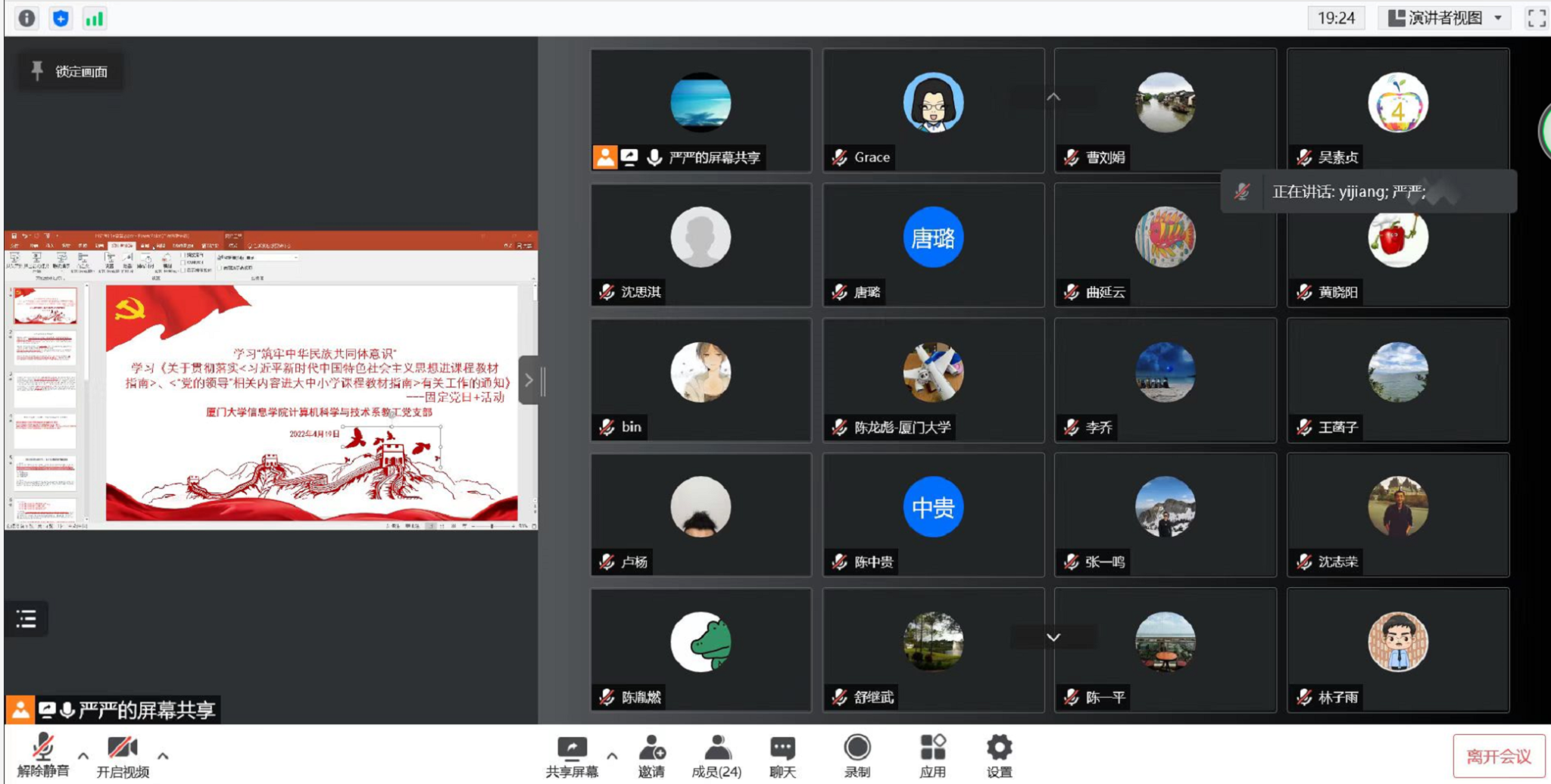 首先,严严同志以习近平总书记关于“铸牢中华民族共同体意识”的重要讲话为指导,带领参会党员们学习了两部分内容。首先是结合《厦门大学信息学院(国家特色化示范性软件学院)铸牢中华民族共同体意识专题学习材料》,学习铸牢中华民族共同体意识的重要意义和基本内涵。其次是学习《习近平新时代中国特色社会主义思想进课程教材指南》、《“党的领导”相关内容进大中小学课程教材指南》等材料,交流探讨如何将习近平新时代中国特色社会主义思想和党的领导相关内容融入到日常的教学科研活动中。