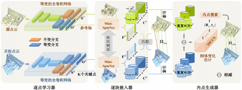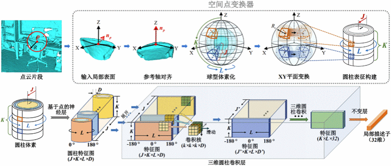 针对现有技术对噪声敏感或旋转退化等问题,提出一种新颖的点云特征学习网络。该网络通过创新性地融合空间点转换器、三维圆柱卷积层及不变层,有效实现了旋转不变、高判别性且普适性强的局部表面描述子提取。该框架成功克服了旋转敏感性等关键挑战,显著提升了特征表达的鲁棒性与泛化性能,为点云特征学习建立了新的理论框架。