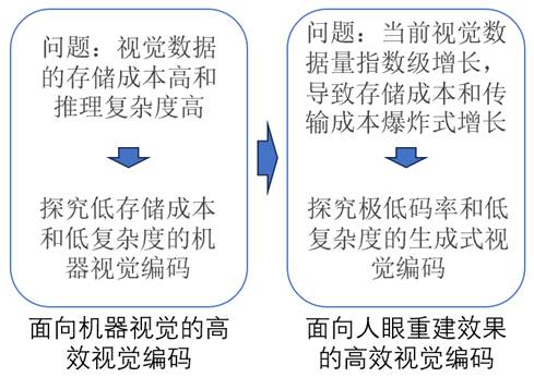 高效图像视频编码包含面向机器视觉的高效视觉编码和面向人眼重建效果的高效视觉编码。针对面向机器视觉的高效视觉编码,在当前多模态大模型和智慧城市治理的背景下,围绕视觉数据的存储成本高和推理复杂度高问题,探究基于低存储成本和低复杂度的机器视觉编码。针对面向人眼重建效果的高效视觉编码,在当前数据量指数级增长的背景下,探究极低码率和低复杂度的生成式视觉编码。研究内容示意图如图3所示。