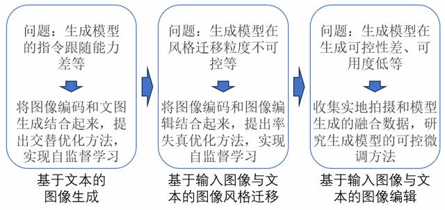 图像生成可采用不同控制信息生成图像。针对基于文本的图像生成,围绕生成模型的指令跟随能力差等问题,提出图文生成与文图生成的交替优化方法。针对基于输入图像与文本的图像编辑,首先探究图像风格迁移,探究自监督学习的方式实现风格迁移粒度,其次探究图像编辑在电商领域的落地应用,并围绕生成模型在生成可控性差、可用度低等问题,收集实地拍摄和模型生成的融合数据,研究生成模型的可控微调方法。研究内容示意图如图2所示。
