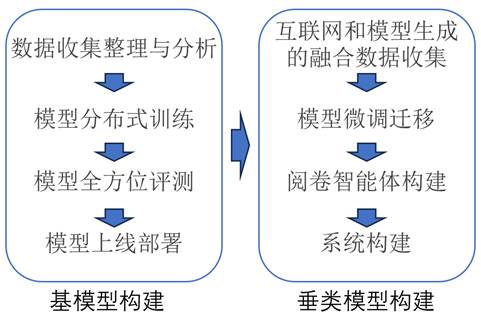针对多模态大模型的基模型构建,参与完成多模态大模型数据收集整理与分析、模型分布式训练、模型全方位评测与模型上线部署等全过程。针对多模态大模型的垂类模型构建,探究教育领域的多模态大模型,围绕手写体识别精度低、标注数据少、模型批改意见准确度低等问题,收集互联网和模型生成的融合数据,研究大模型微调方法,研发批改智能体,完整研发一套创新性系统。研究内容示意图如图1所示。