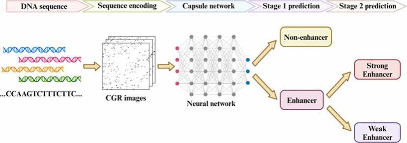 提出了基于深度学习的增强子识别框架,用于发现非编码区的关键调控元件。该方法采用 混沌游戏图编码和胶囊网络,将DNA序列转化为图像形式,并捕捉其中的空间依赖关系与局部特征,显著提升了增强子识别准确率。