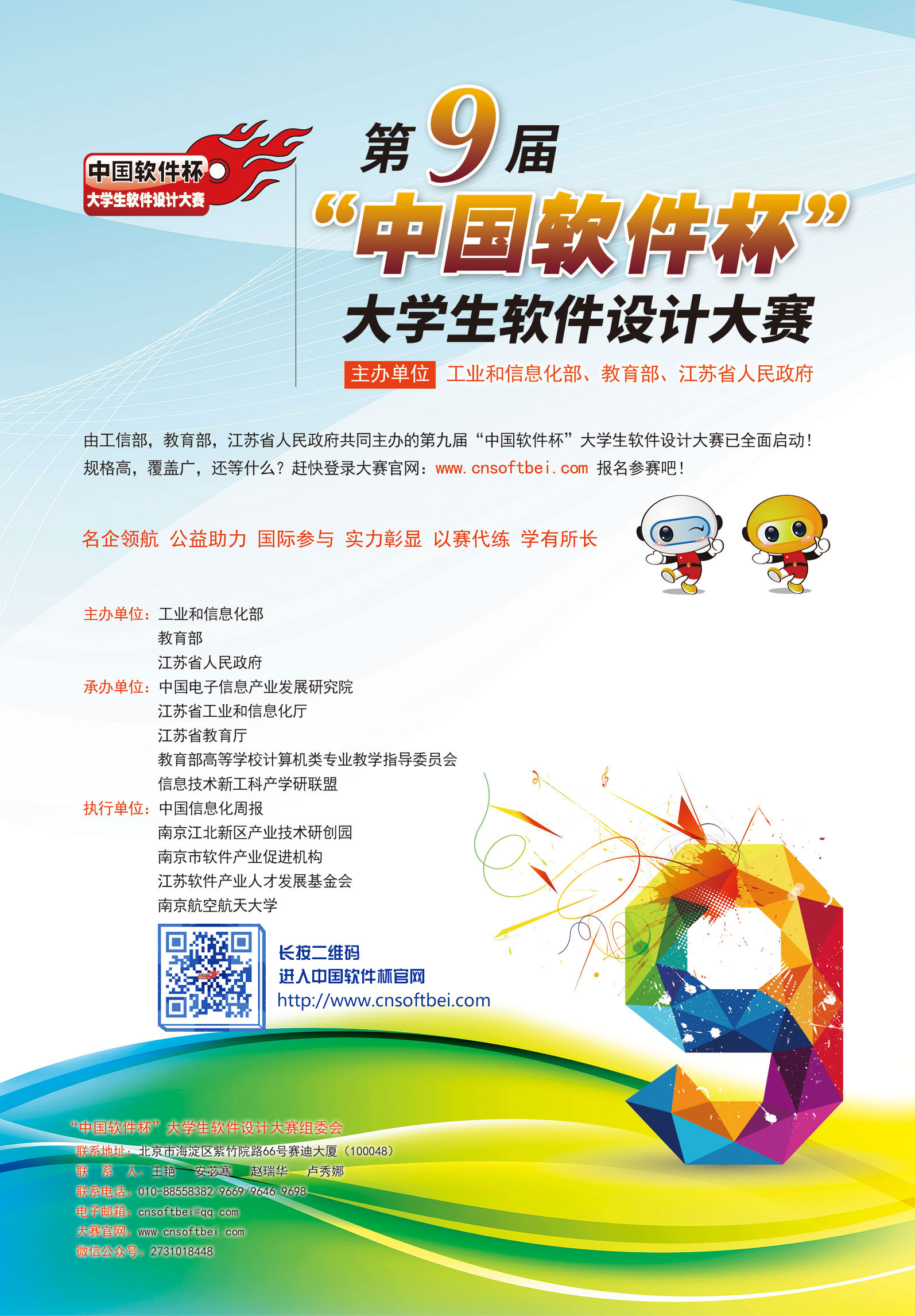 为贯彻落实《国家中长期教育改革和发展规划纲要(2010-2020 年)》,科学引导高校青年学子积极参加科研活动,切实增强自主创新能力和实际动手能力,实现应用型人才培养和产业需求的有效衔接,推动我国软件和信息技术服务业又好又快发展,工业和信息化部、教育部和江苏省人民政府共同主办了面向中国高校及广大海外院校在校学生(含高职)的纯公益性软件设计大赛,即“中国软件杯”大学生软件设计大赛(以下简称“大赛”)。现将第九届大赛有关事项通知如下: